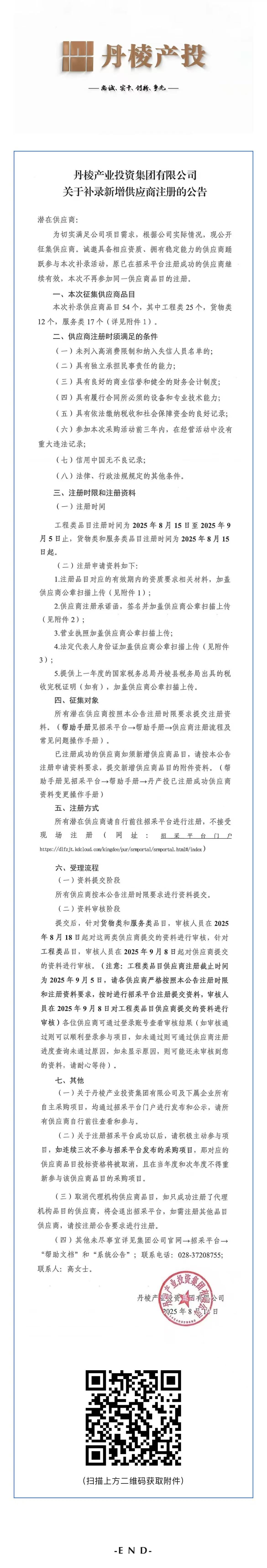 丹棱產(chǎn)業(yè)投資集團(tuán)有限公司關(guān)于補(bǔ)錄新增供應(yīng)商注冊(cè)的公告