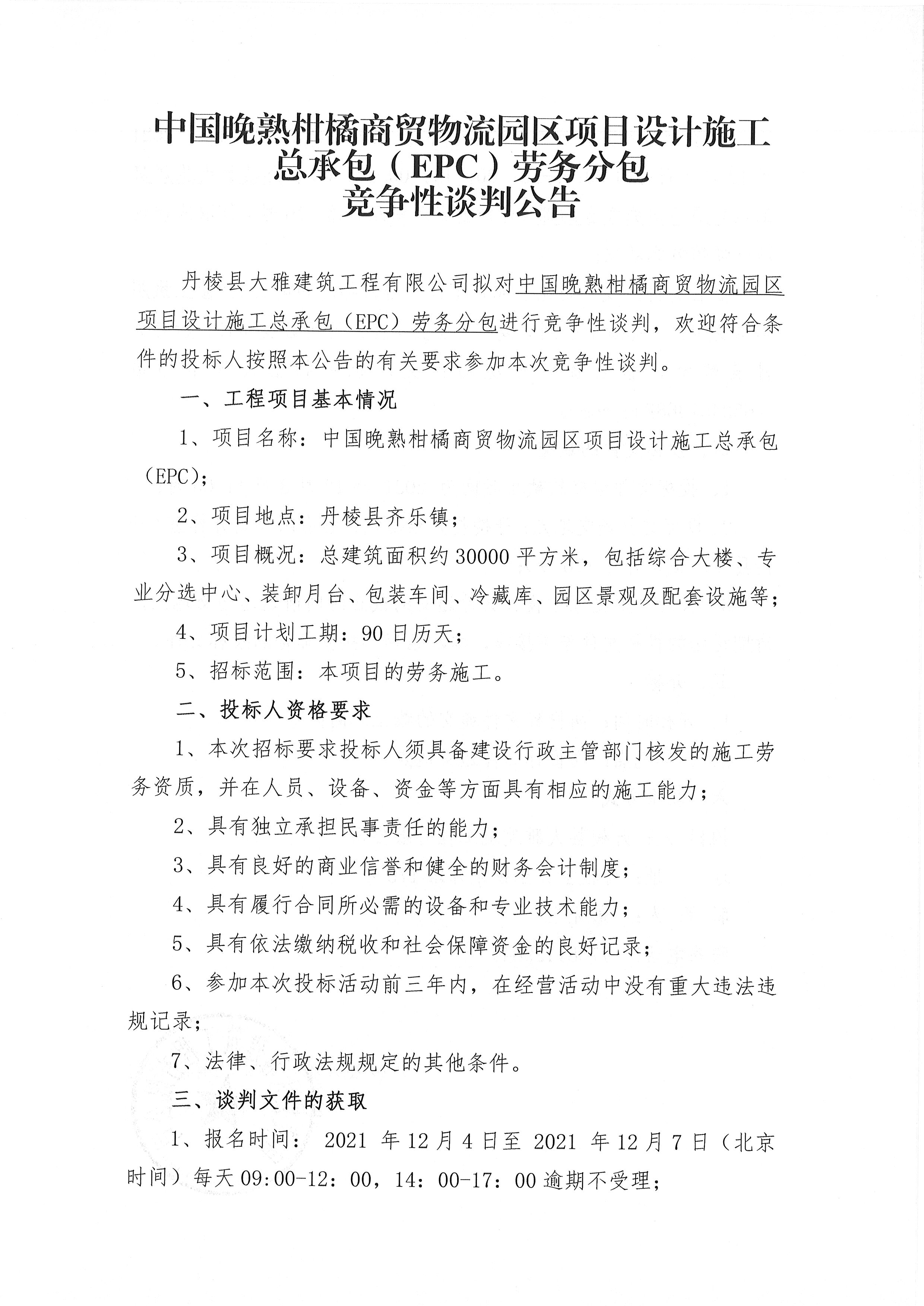 【大雅建筑公司】中國(guó)晚熟柑橘商貿(mào)物流園區(qū)項(xiàng)目設(shè)計(jì)施工總承包(EPC)勞務(wù)分包競(jìng)爭(zhēng)性談判公告