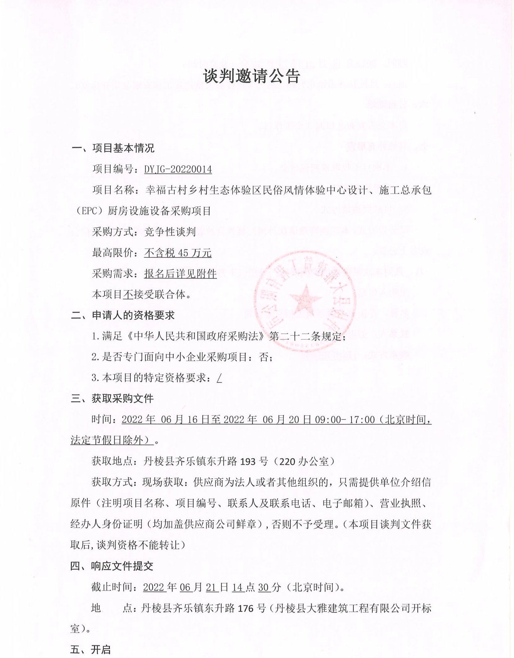 幸福古村鄉(xiāng)村生態(tài)體驗區(qū)民俗風情體驗中心設計、施工總承包(EPC)廚房設施設備采購項目談判邀請公告