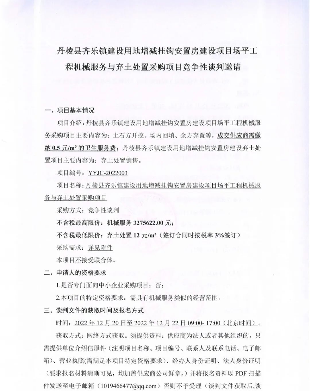 丹棱縣齊樂鎮(zhèn)建設(shè)用地增減掛鉤安置房建設(shè)項(xiàng)目場(chǎng)平工程機(jī)械服務(wù)與棄土處置采購(gòu)項(xiàng)目競(jìng)爭(zhēng)性談判邀請(qǐng)