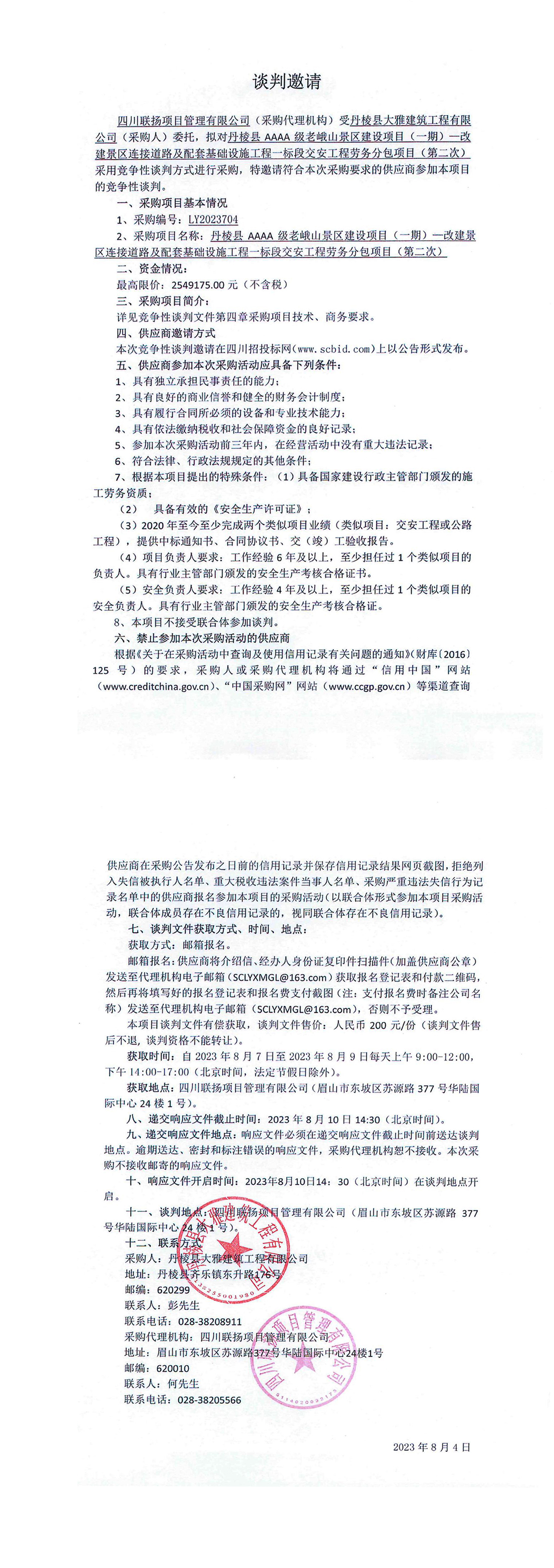 丹棱縣AAAA級老峨山景區(qū)建設(shè)項目(一期)一改建景區(qū)連接道路及配套基礎(chǔ)設(shè)施工程一標段交安工程勞務(wù)分包項目(第二次)談判邀請