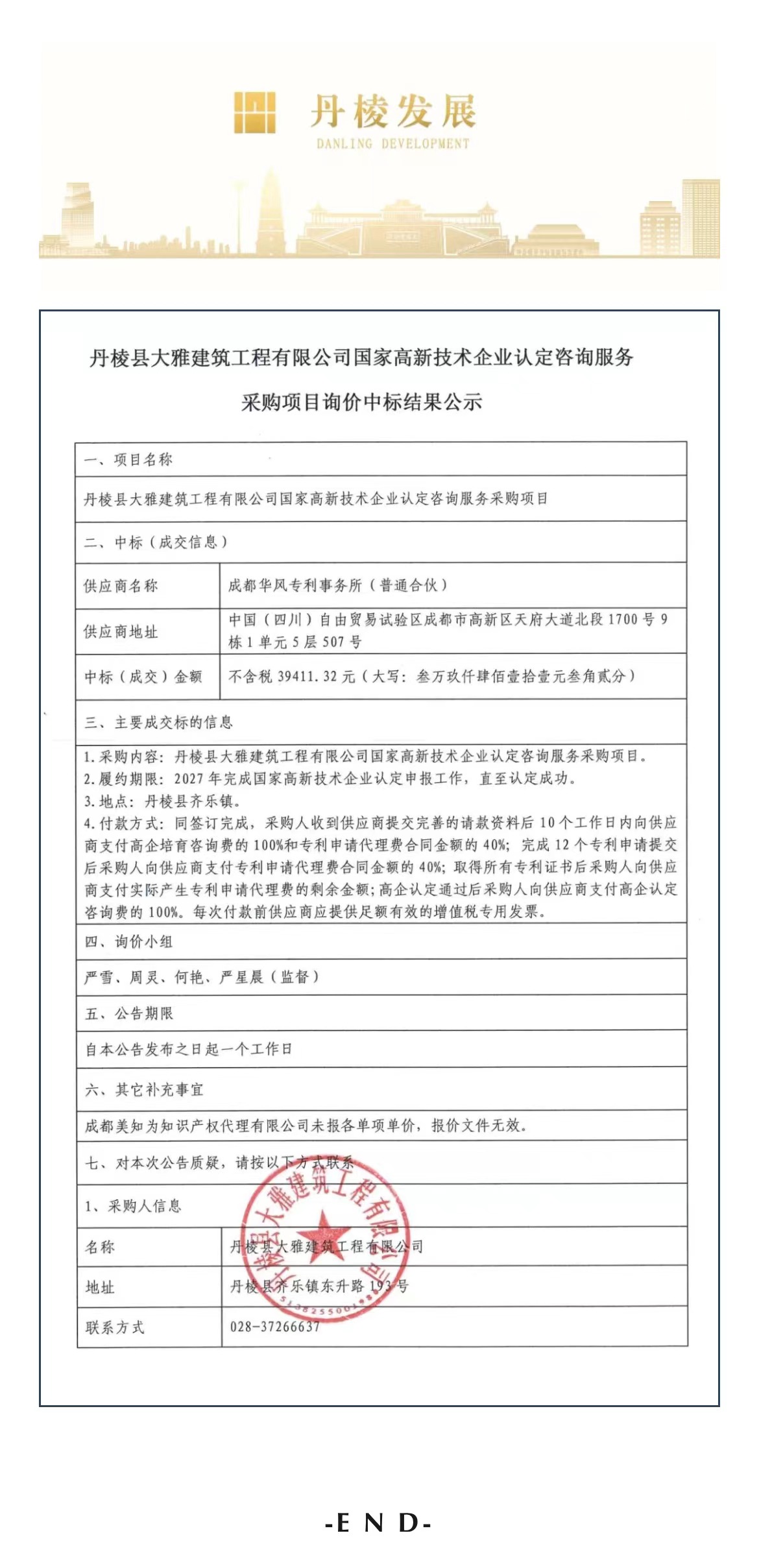 丹棱縣大雅建筑工程有限公司國(guó)家高新技術(shù)企業(yè)認(rèn)定咨詢(xún)服務(wù)采購(gòu)項(xiàng)目詢(xún)價(jià)中標(biāo)結(jié)果公示