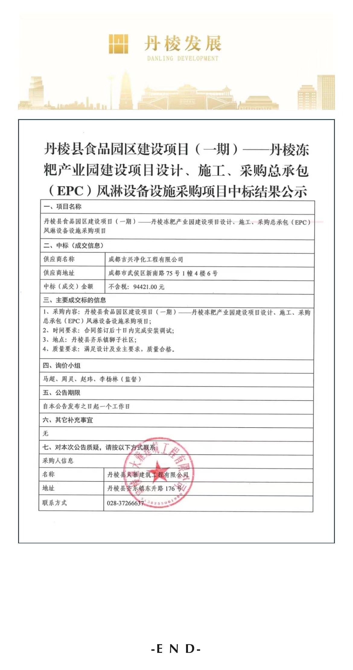 丹棱縣食品園區(qū)建設(shè)項(xiàng)目(一期)—丹棱凍粑產(chǎn)業(yè)園建設(shè)項(xiàng)目設(shè)計(jì)、施工、采購總承包(EPC)風(fēng)淋設(shè)備設(shè)施詢價采購項(xiàng)目中標(biāo)結(jié)果公示