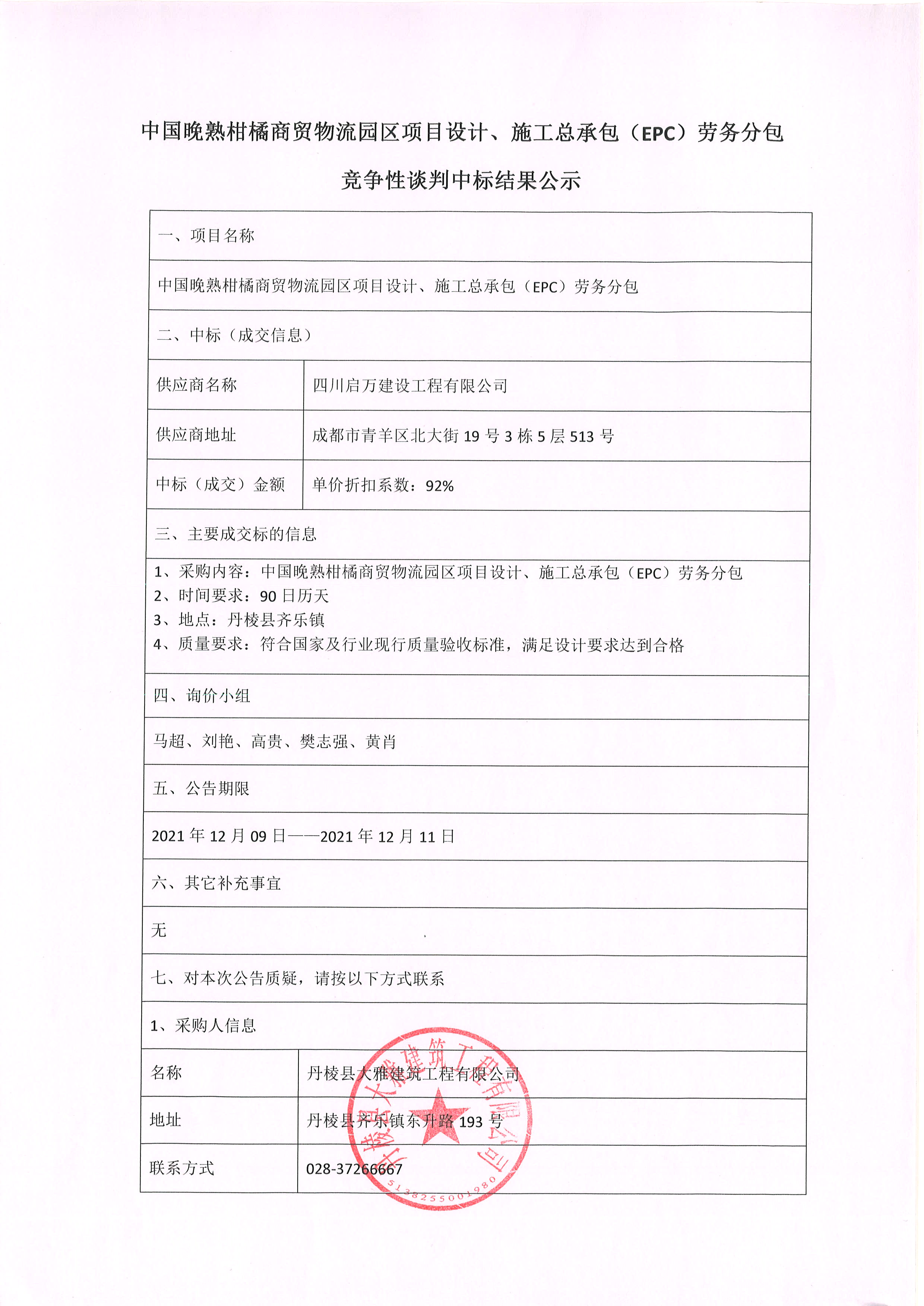【大雅建筑公司】中國晚熟柑橘商貿(mào)物流園區(qū)項目設計、施工總承包(EPC)勞務分包競爭性談判中標結果公示