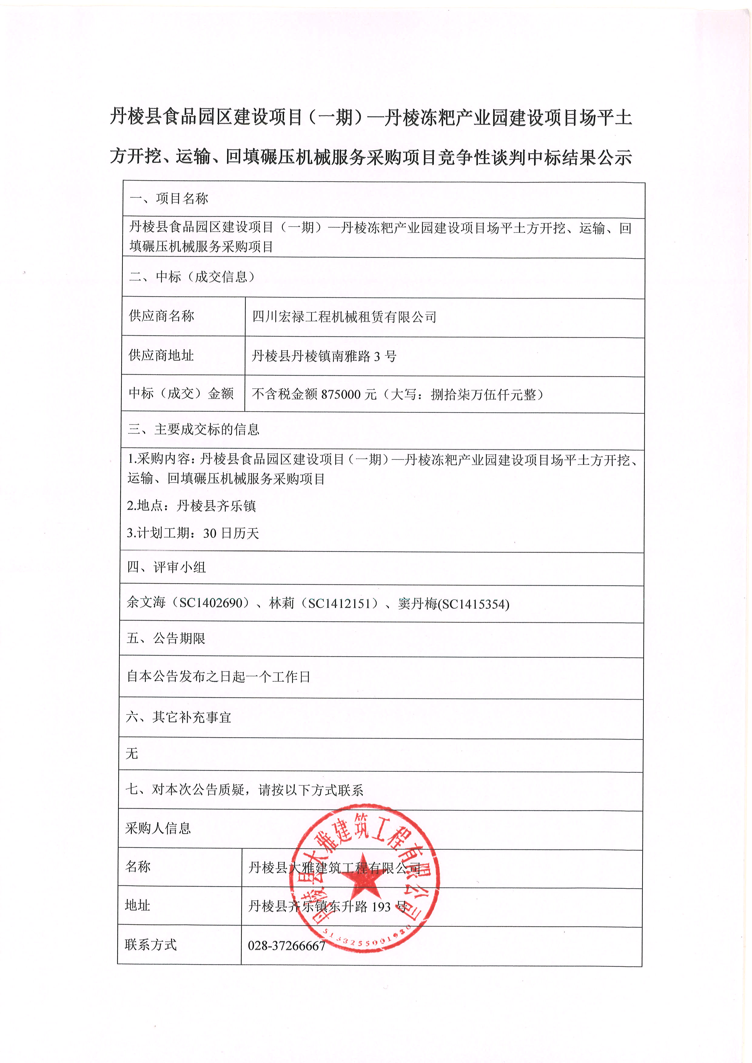 丹棱縣食品園區(qū)建設(shè)項目(一期)-丹棱凍粑產(chǎn)業(yè)園建設(shè)項目場平土 方開挖、運輸、回填碾壓機械服務(wù)采購項目競爭性談判中標結(jié)果公示