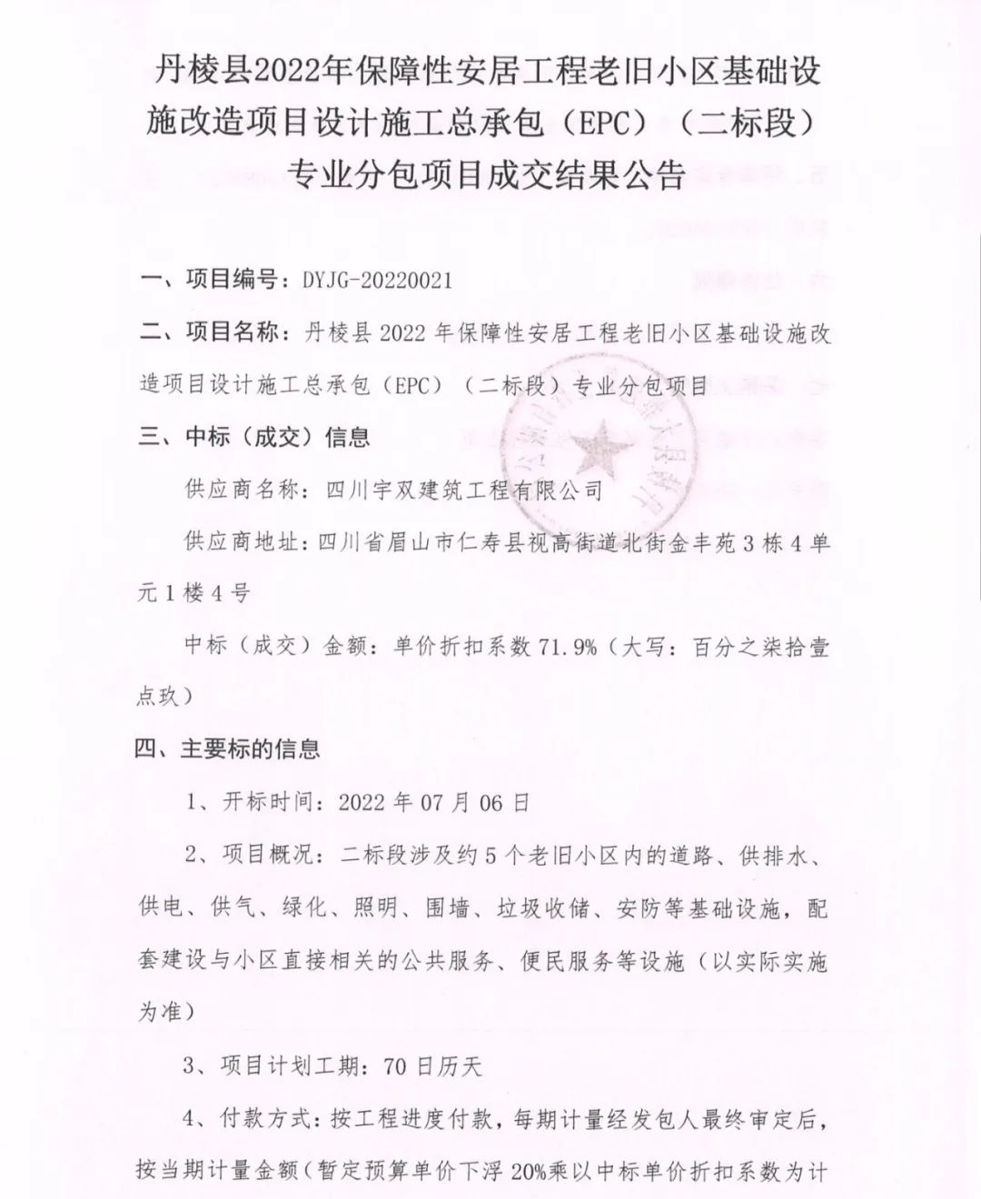 丹棱縣2022年保障性安居工程老舊小區(qū)基礎設施改造項目設計施工總承包(EPC)(二標段)專業(yè)分包項目成交結果公告