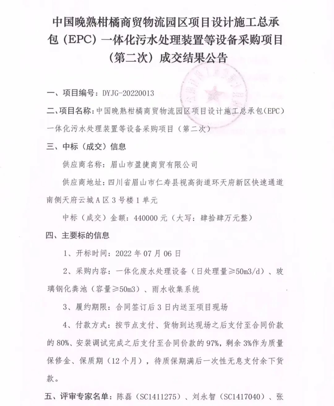 中國(guó)晚熟柑橘商貿(mào)物流園區(qū)項(xiàng)目設(shè)計(jì)施工總承包(EPC)一體化污水處理裝置等設(shè)備采購(gòu)項(xiàng)目(第二次)成交結(jié)果公告