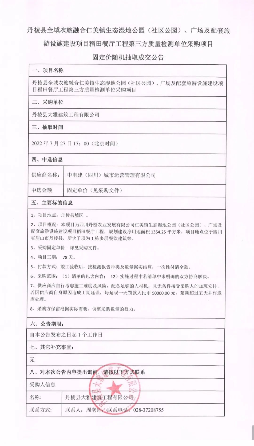 仁美鎮(zhèn)生態(tài)濕地公園(社區(qū)公園)、廣場及配套旅游設(shè)施建設(shè)項(xiàng)目稻田餐廳工程第三方質(zhì)量檢測單位采購項(xiàng)目固定價(jià)隨機(jī)抽取成交公告