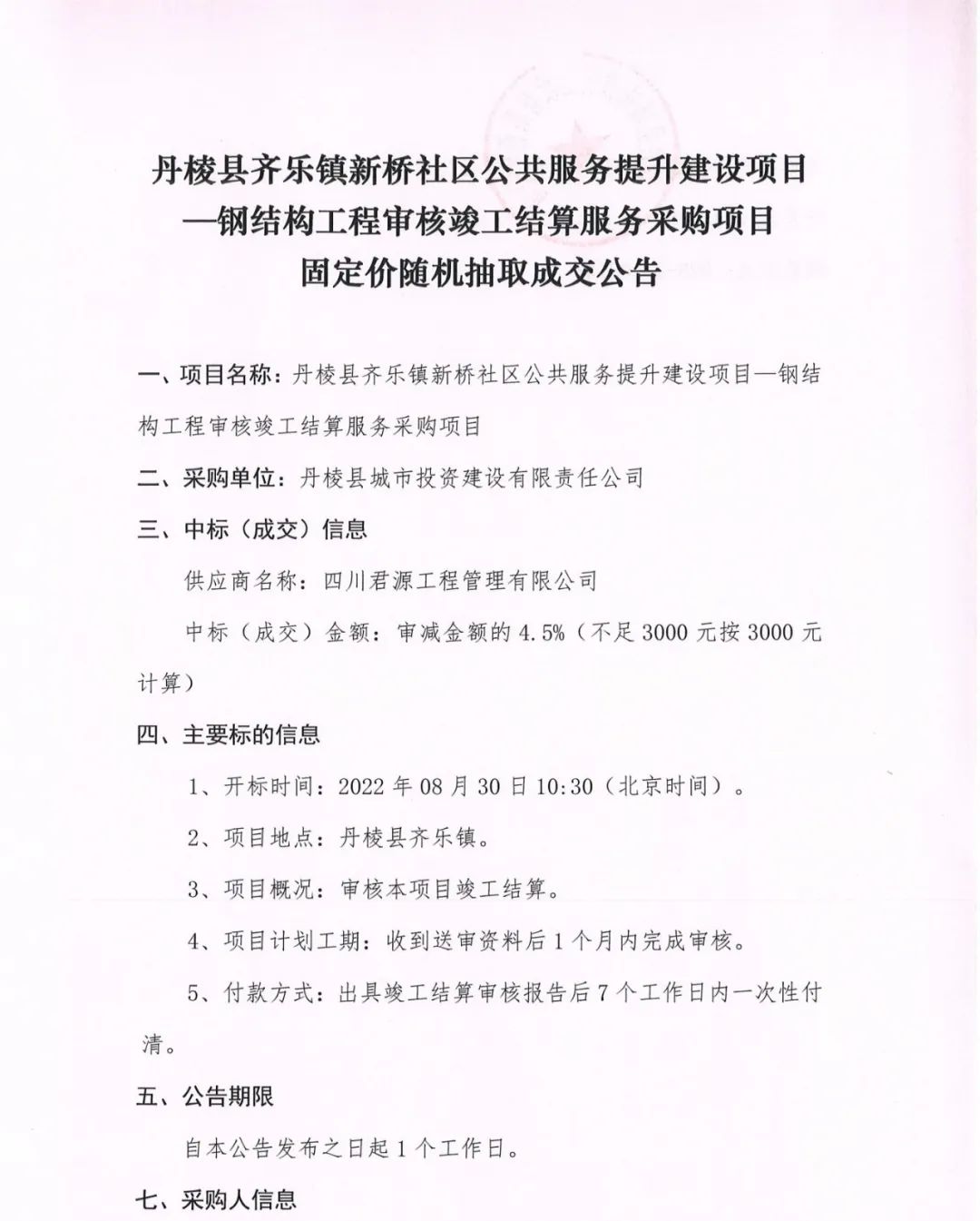 丹棱縣齊樂鎮(zhèn)新橋社區(qū)公共服務提升建設項目--鋼結構工程審核竣工結算服務采購項目固定價隨機抽取成交公告