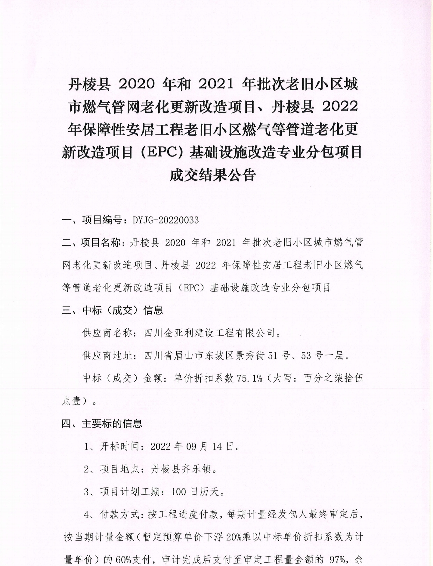 丹棱縣2020年和2021年批次老舊小區(qū)城市燃?xì)夤芫W(wǎng)老化更新改造項(xiàng)目、丹棱縣2022年保障性安居工程老舊小區(qū)燃?xì)獾裙艿览匣赂脑祉?xiàng)目(EPC)基礎(chǔ)設(shè)施改造專(zhuān)業(yè)分包項(xiàng)目 成交結(jié)果公告