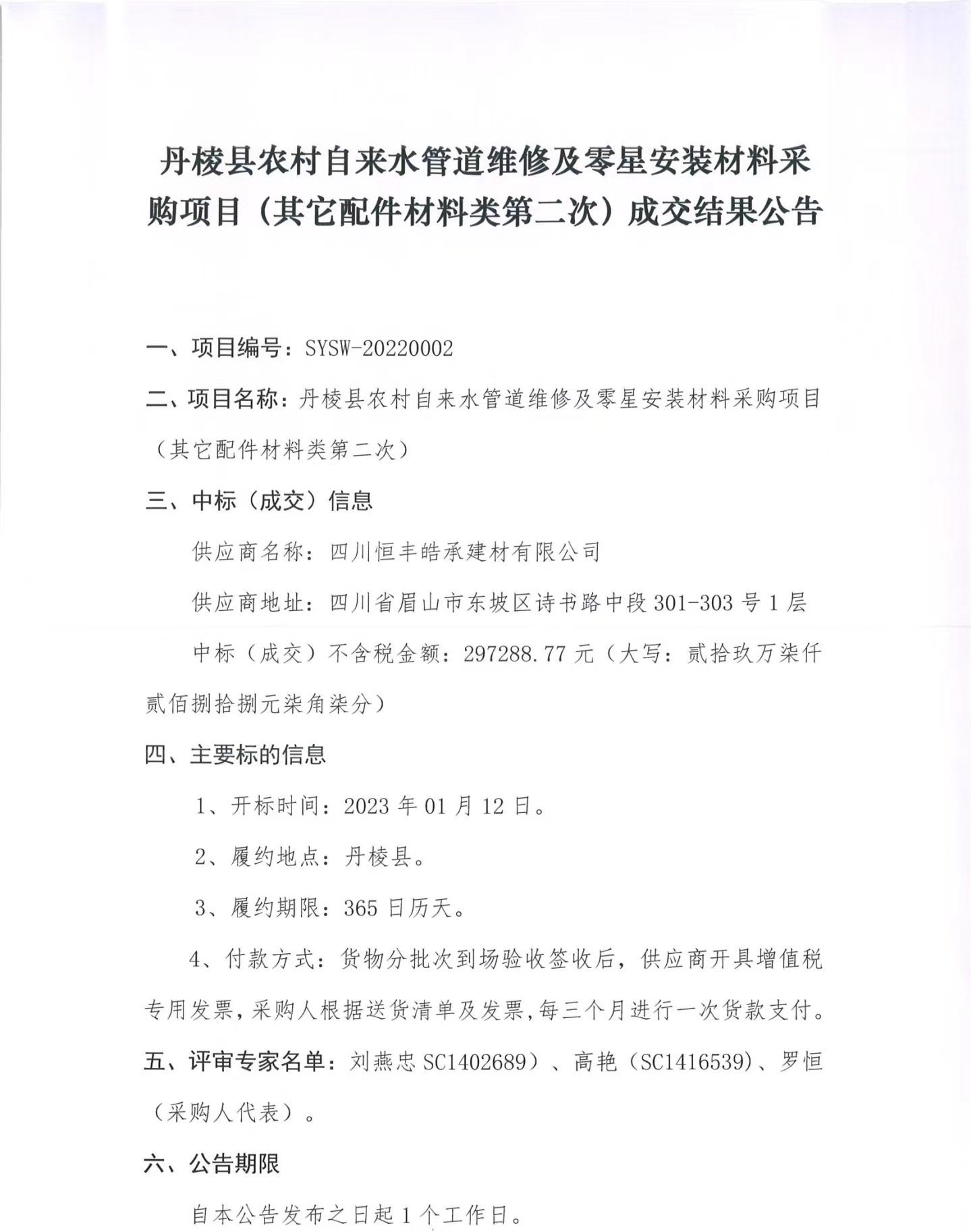 丹棱縣農(nóng)村自來水管道維修及零星安裝材料采購項(xiàng)目(其它配件材料類第二次) 成交結(jié)果公告