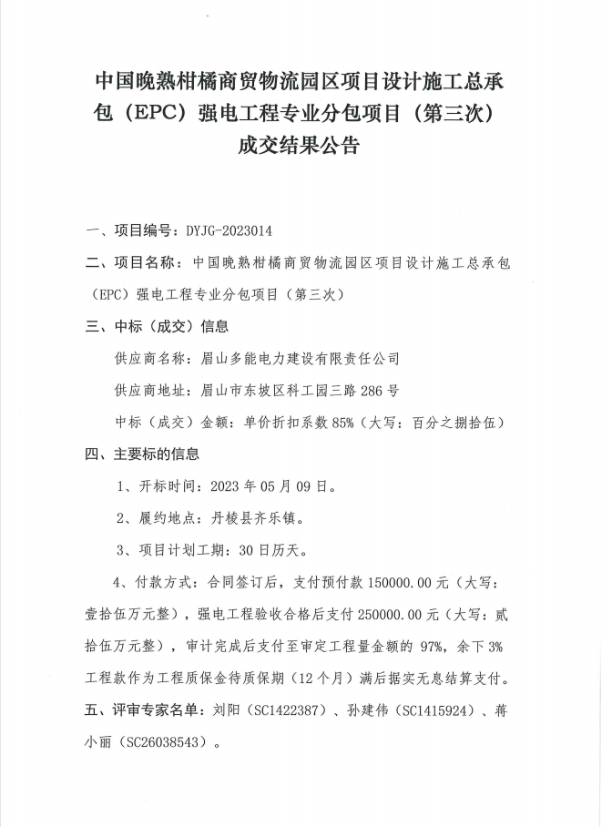 中國晚熟柑橘商貿物流園區(qū)項目設計施工總承包(EPC)強電工程專業(yè)分包項目(第三次)成交結果公告