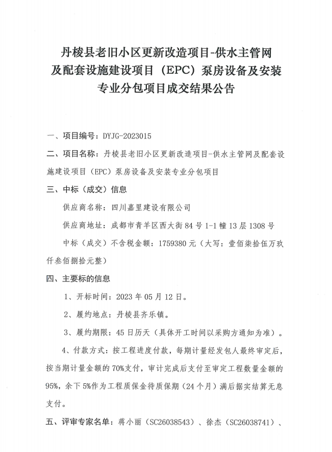 丹棱縣老舊小區(qū)更新改造項(xiàng)目-供水主管網(wǎng)及配套設(shè)施建設(shè)項(xiàng)目(EPC)泵房設(shè)備及安裝專業(yè)分包項(xiàng)目成交結(jié)果公告