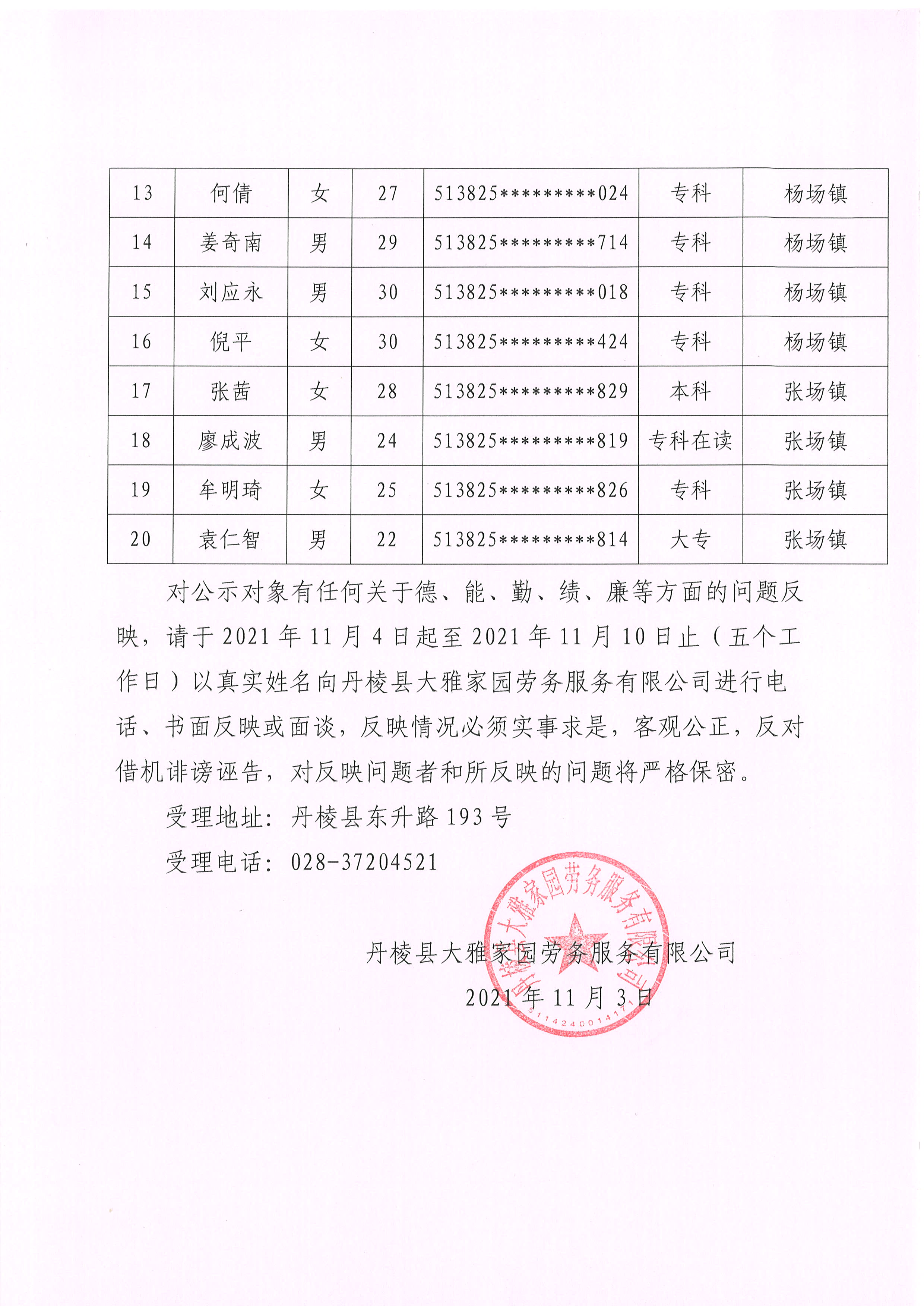 【大雅勞務公司】丹棱縣大雅家園勞務服務有限公司關于為丹棱縣公安局、縣司法局、縣禁毒委員會辦公室公開招聘勞務派遣人員的擬聘用和儲備人員公示