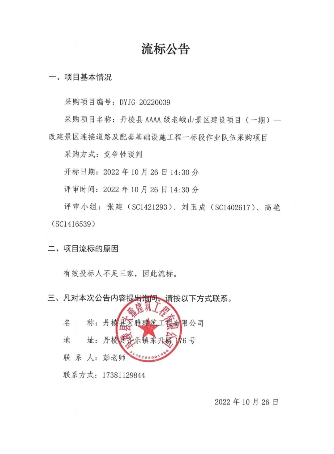 丹棱縣AAAA級老峨山景區(qū)建設項目(一期)--改建景區(qū)連接道路及配套基礎設施工程一標段作業(yè)隊伍采購項目流標公告