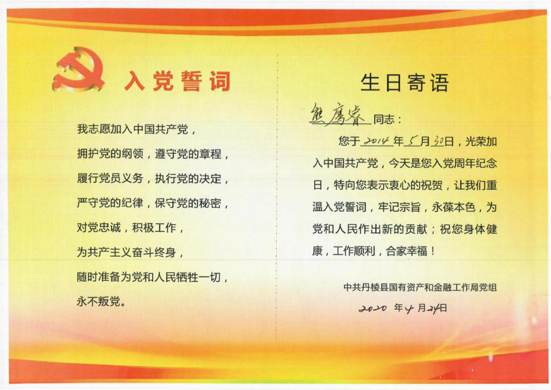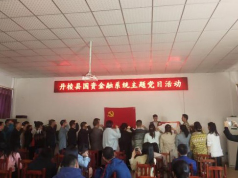 工作安排后,縣國資金融局黨組集體為5月入黨黨員過政治生日,縣國資金融局(縣金融服務(wù)中心)副主任茍永慶同志為“過生日”的黨員們送上精心制作的“黨員政治生日卡”,勉勵(lì)黨員同志要“常思入黨初衷、銘記入黨誓詞、牢記黨員義務(wù)”,發(fā)揮黨員先鋒模范作用,在今后的工作中不斷創(chuàng)先爭優(yōu),做好表率。活動(dòng)最后,全體黨員同志在縣國資金融局黨組成員、副局長潘國榮同志的帶領(lǐng)下重溫入黨誓詞、面對黨旗莊嚴(yán)宣誓。